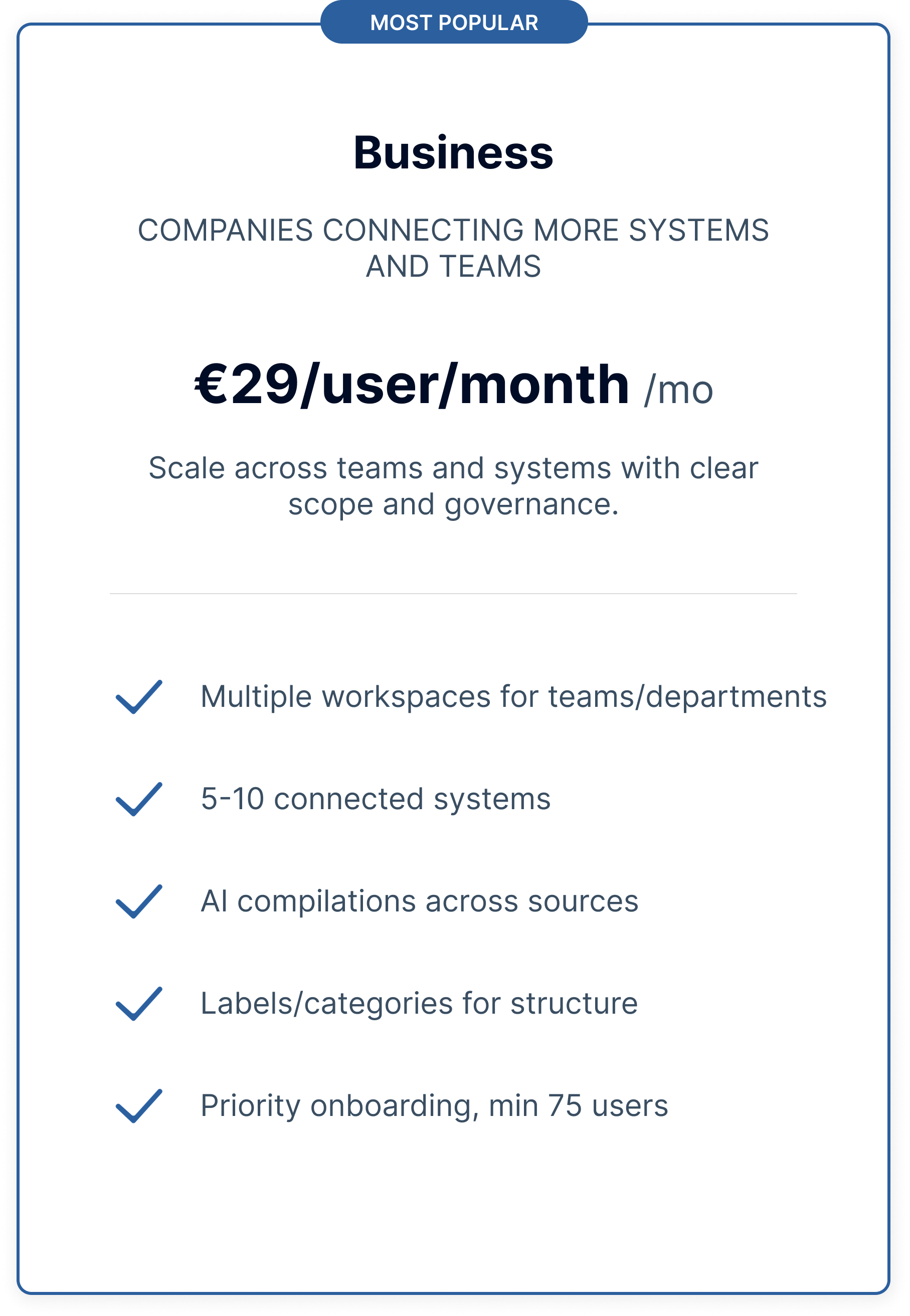 The pilot has a fixed price of €4,900 and includes setup for 1 workspace, up to 2 systems, and up to 25 users. This fee is 100% credited against your first year subscription if you sign within 30 days after the pilot ends.