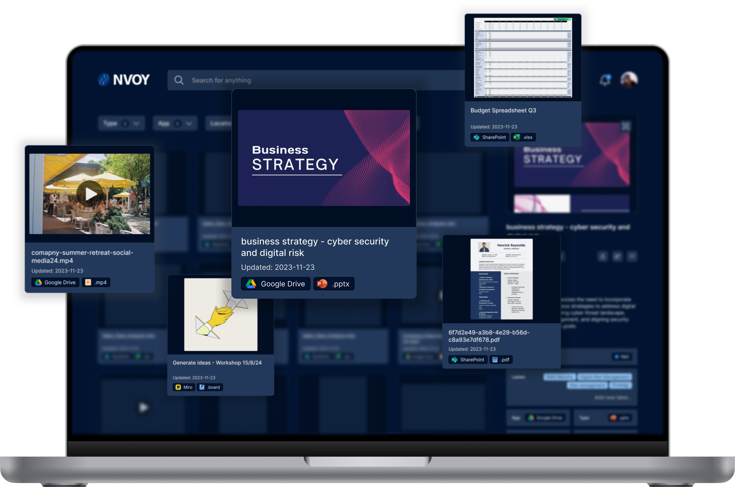 NVOY connects your existing systems and gives you one unified search view across files and internal data. Your AI agent indexes what's inside your content - text, visuals, speech, and metadata—so you can search, preview, summarize, compile, and share the right version with control.