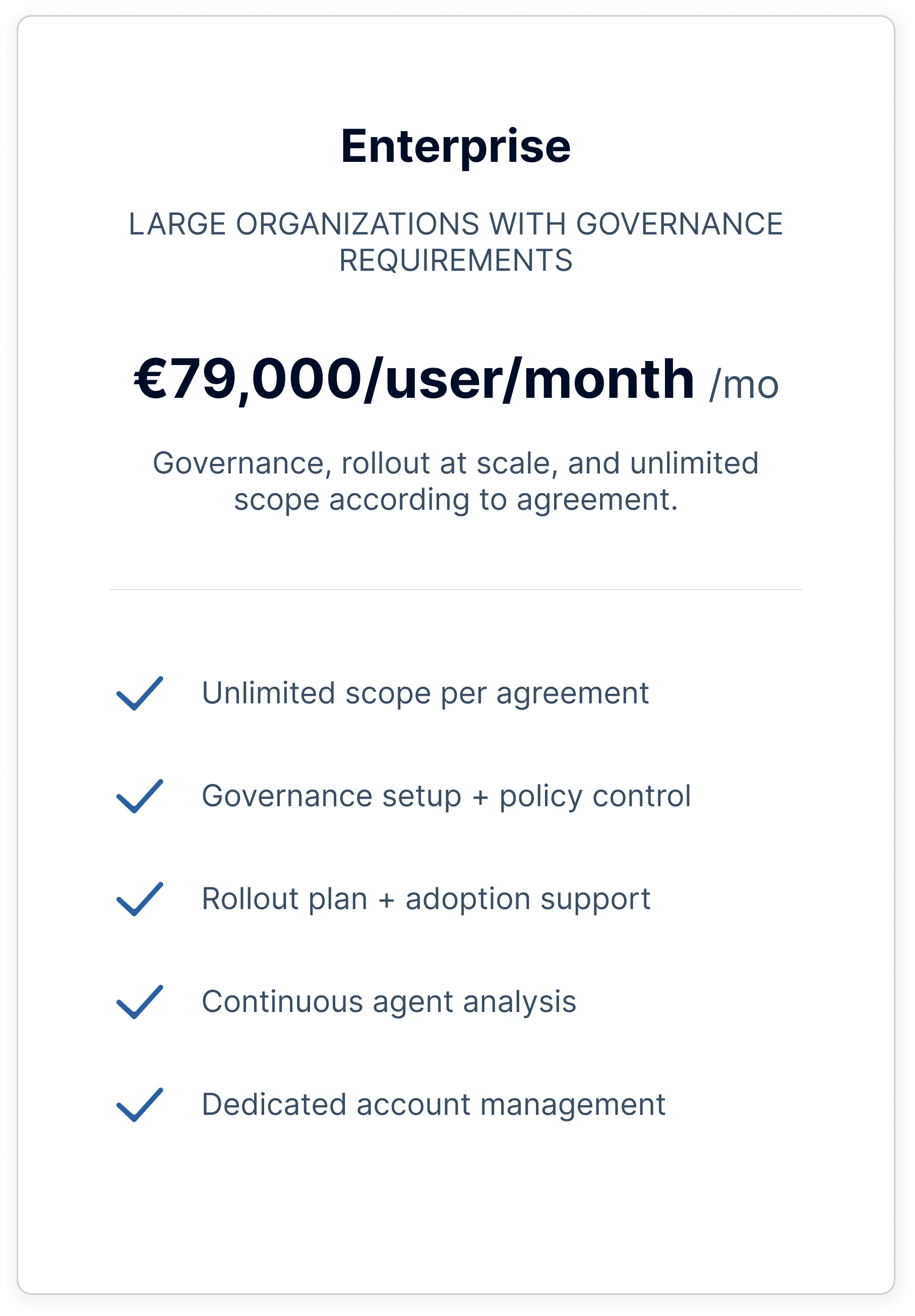 Start with a pilot, scale to your entire organization. Transparent pricing that grows with your team.