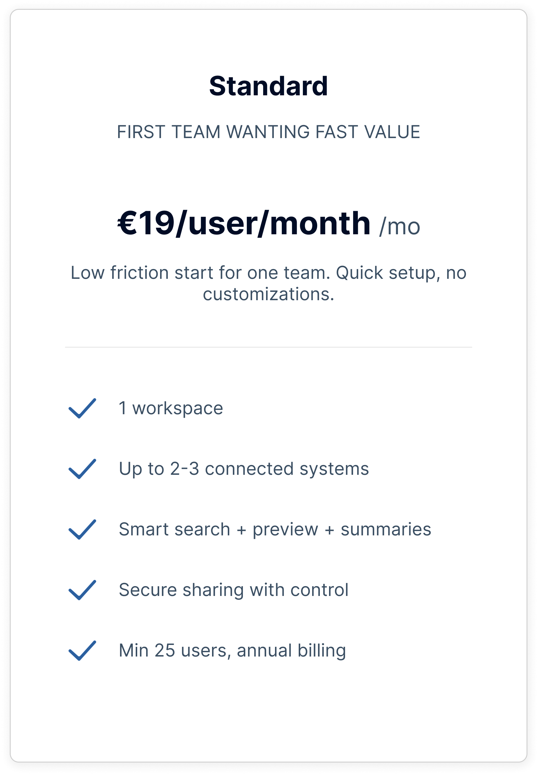 Most teams see value within days. Once systems are connected, users can immediately start searching, previewing, and summarizing material. A typical pilot runs for 30 days and is designed to prove measurable impact quickly.