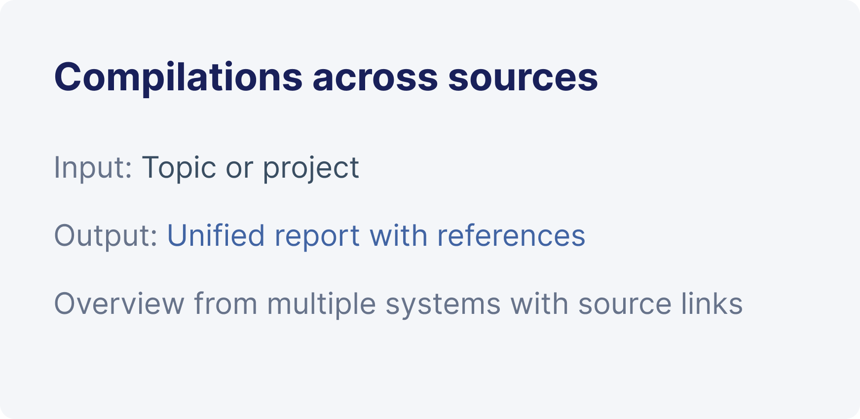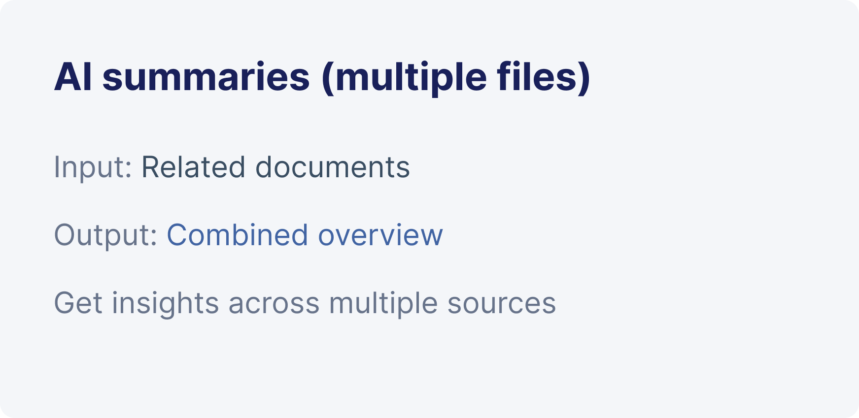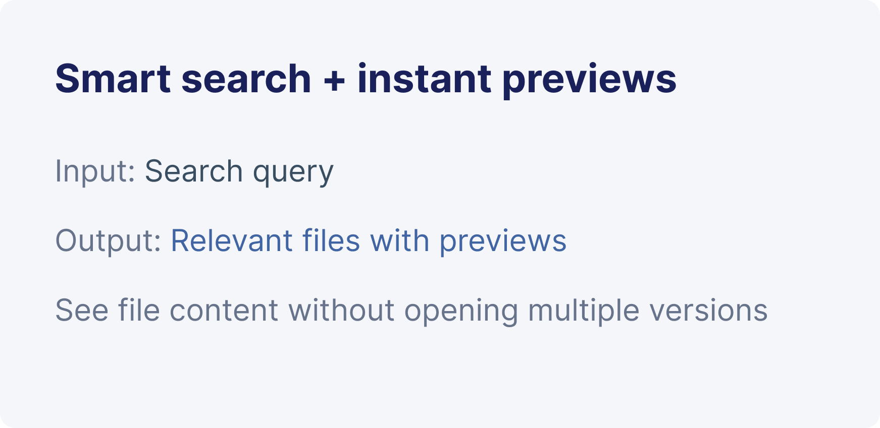 One search view across everything. Preview before opening. Share with full control. Smart search results, instant previews, AI summaries, cross-source compilations, and controlled sharing.